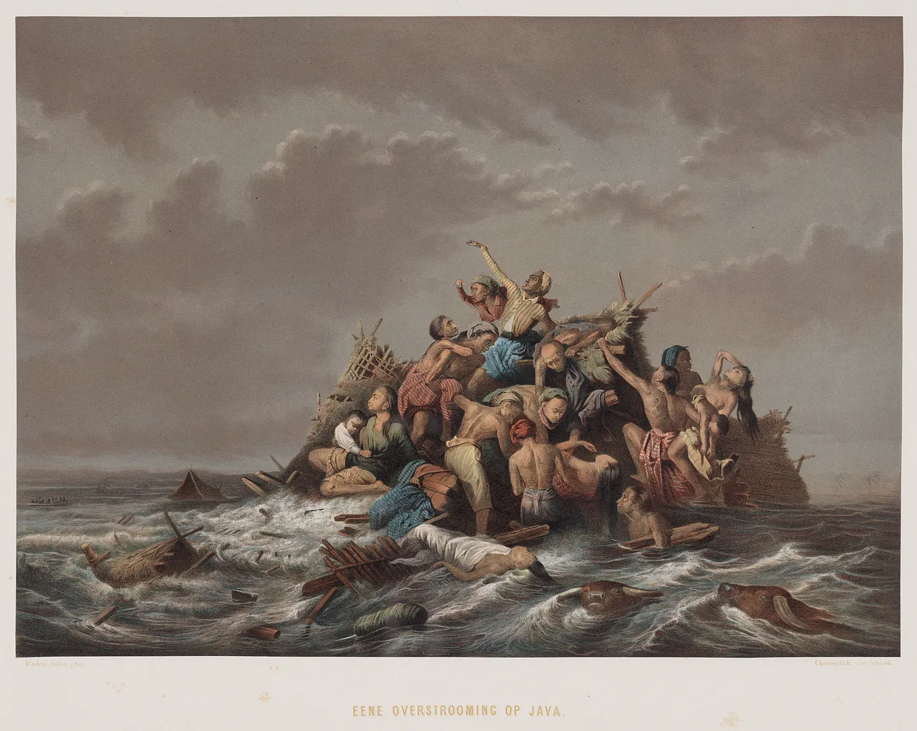 This painting shows people on a raft in a flooded river in central Java's Jawa Tengah province.