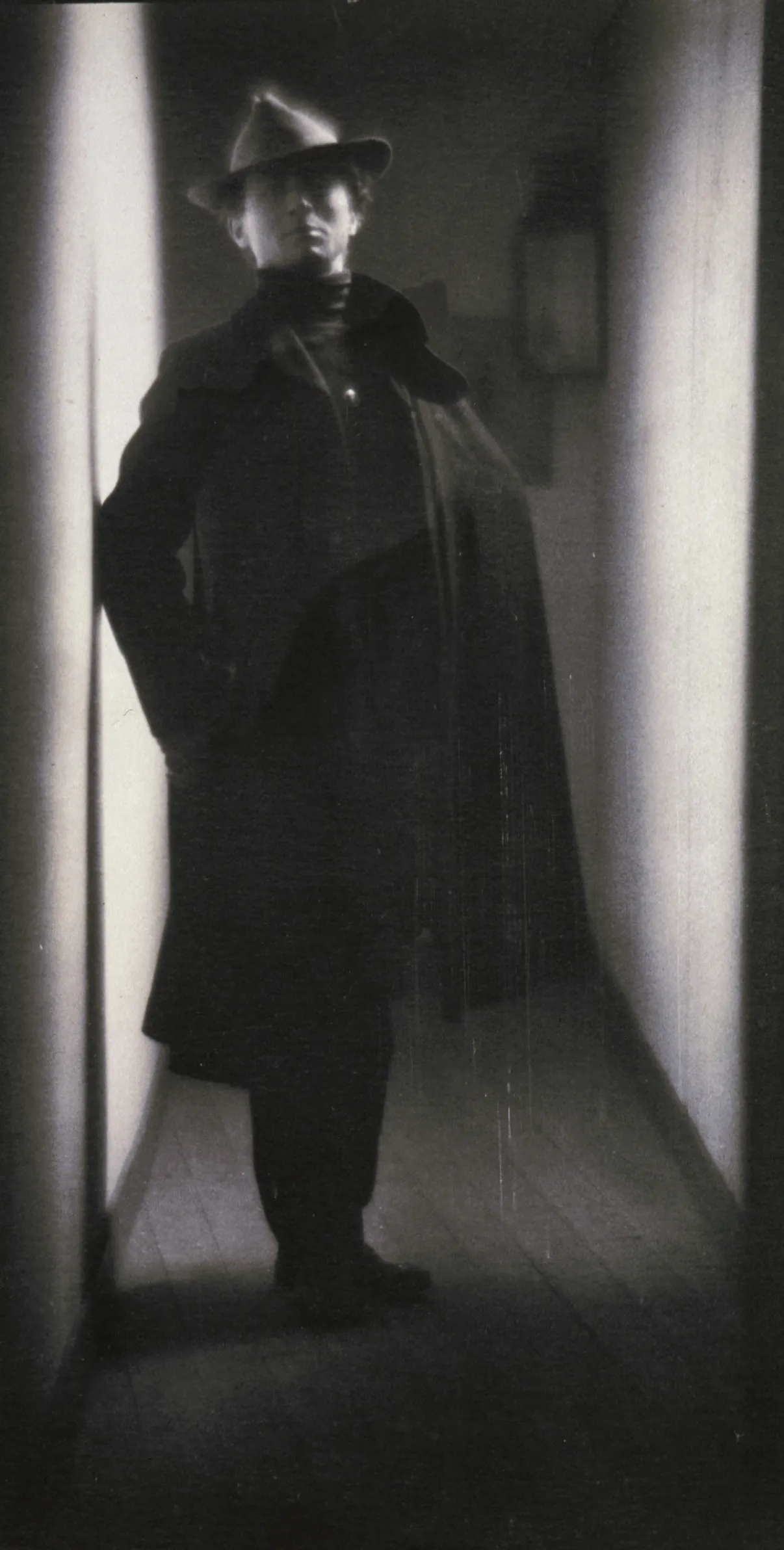 Edward Steichen in coat and hat, standing in hallway