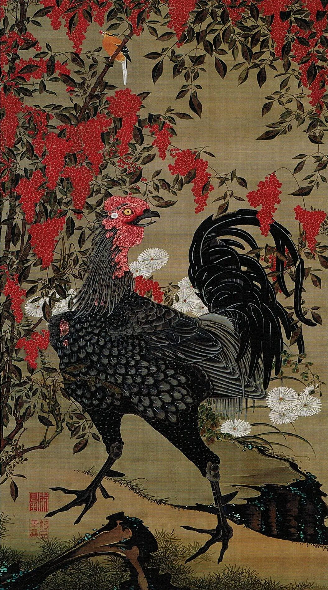 One of thirty silk hanging scrolls belonging to the collection called Doshoku Sai-e (Colorful Realm of Living Beings). The scrolls were made for the Shokoku-ji Temple, Kyoto in honor of the Shakamuni ...